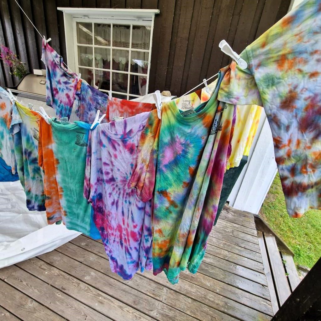 Etter batikkverkstedet henger nå skjortene ute til tørk også. Resultater verkstedet skulle vises fram, og det ble noen fantastiske og fargeglade leirskjorter ut av det.
