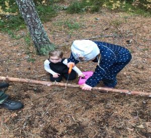 Hannah og Tiril samarbeider godt om å sage opp materiell de finner i skogen.