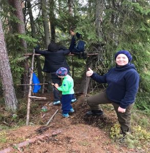 Barna tok med seg verktøy for å fortsette å bygge på hytta lengre oppi skogen. De var så opptatt av det at navn-lagingen gikk i glemmeboka. Alle barna var superflinke – de sagde, spikret og bygde hytta helt på egen hånd. Voksne fikk lov til å titte innom. Det var herlig å se hvor godt de samarbeider og inkluderer hverandre i byggingen.