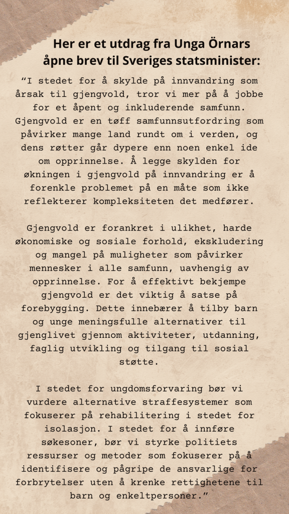 At kriminaliteten blant veldig unge i Sverige har blitt et så stort og økende problem, går det ikke an å kunne forklare på en enkel måte. Når liv går tapt i nærmiljøene på den måten er det forståelig at mange kjenner seg utrygge der de bor. Dette påvirker mange barn sin mulighet til å vokse opp i trygge omgivelser. Noe må gjøres, men Framfylkingen tror lite på løsninger som innebærer fotlenke eller lignende straffer for barn i jakten på ro og orden.